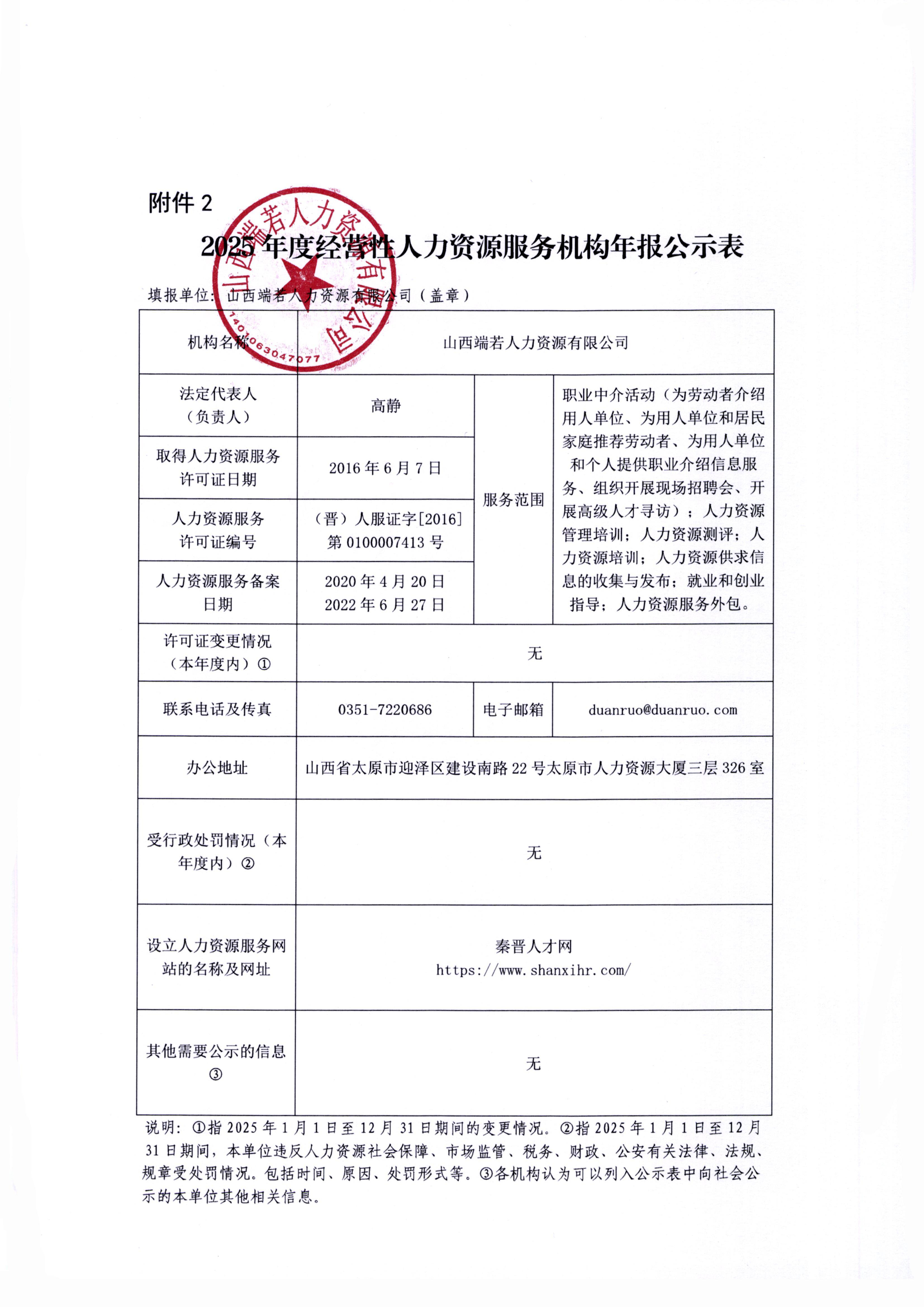 【年报公示】2025年度经营性人力资源服务机构年报公示表