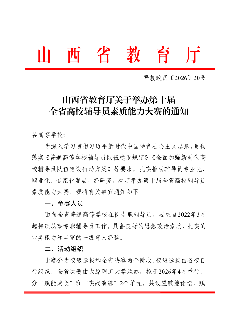 近日,山西省教育厅发布了《关于举办第十届全省高校辅导员素质能力大赛的通知》。本次大赛赛制升级、环节严谨,对命题的科学性、规范性与公平性提出了极高要求。