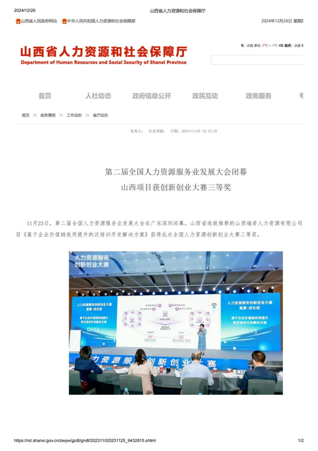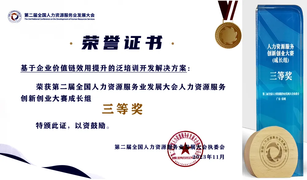 2023年11月,公司项目在第二届全国人力资源服务业发展大会上荣获全国人力资源服务创新创业大赛成长组三等奖。本届大会由人力资源社会保障部与广东省人民政府共同主办,人力资源社会保障部人力资源流动管理司、广东省人力资源和社会保障厅、深圳市人民政府联合承办,是我国人力资源服务领域规格最高、规模最大、影响力最广的行业盛会。此次获奖充分体现了公司在人力资源服务创新方面的实践成果与行业认可。