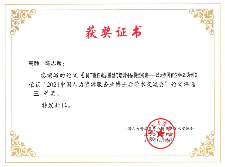 2021年,公司研究成果在中国人力资源服务业博士后学术交流会征文评选中荣获三等奖。该评选活动由人力资源社会保障部人力资源流动管理司、全国博士后管委会办公室、中国博士后科学基金会共同主办,是全国博管办重点开展的全国博士后学术交流活动之一。此项荣誉充分体现了评选活动的权威性与高层次学术水准,对于促进我国人力资源服务业科学研究发展、培养高层次科研后备人才具有重要意义。