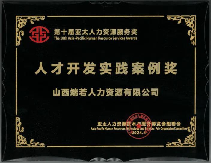 2024年4月,公司受邀参加第十届亚太人力资源服务奖颁奖仪式,并荣获“人才开发实践案例奖”。该奖项是亚太地区人力资源服务领域具有广泛影响力的行业荣誉,旨在表彰在人才开发实践中取得突出成效的优秀案例。此次获奖充分体现了公司在人才开发领域的创新探索与实践成果,彰显了公司在推动人才队伍建设与人力资源管理实践方面的专业能力与行业认可度。