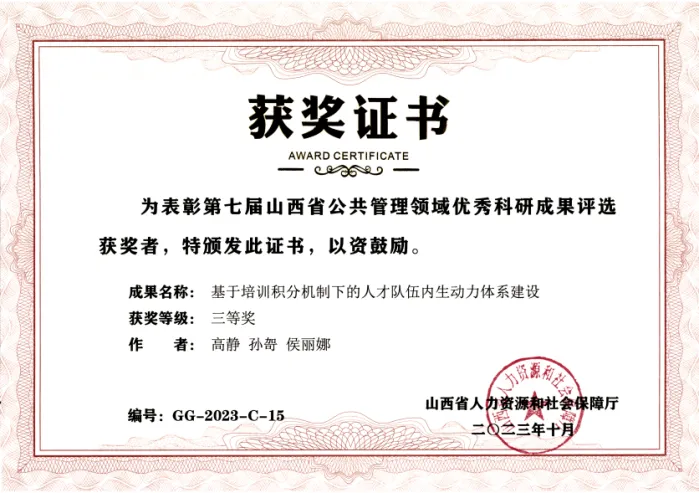 2023年10月,公司研究成果《基于培训积分机制下的人才队伍内生动力体系建设》荣获第七届山西省公共管理领域优秀科研成果三等奖。该成果有效促进了人力资源管理科研成果的交流、推广与应用,活跃了公共管理领域的学术氛围,提升了理论研究水平与业务实践能力,在社会层面产生了广泛而积极的影响。