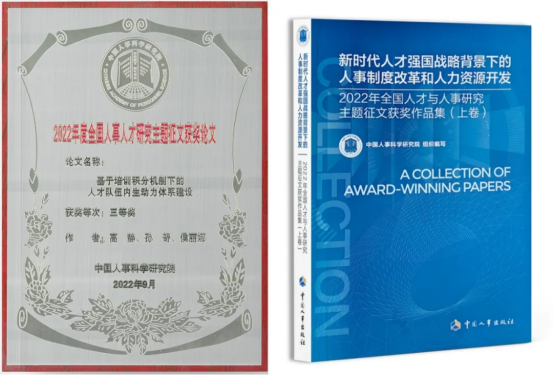 2022年,公司研究成果《基于培训积分机制下的人才队伍内生动力体系建设》在全国人事人才研究主题征文中荣获三等奖,并成功入选由中国人事科学研究院组织编写、中国人事出版社出版的《新时代人才强国战略背景下的人事制度改革与人力资源开发——2022年全国人才与人事主题征文获奖作品集》。该文集集中展现了我国人事人才领域理论与实践研究的前沿成果,是服务科学决策的重要参考,在业内具有广泛而深远的学术影响力。