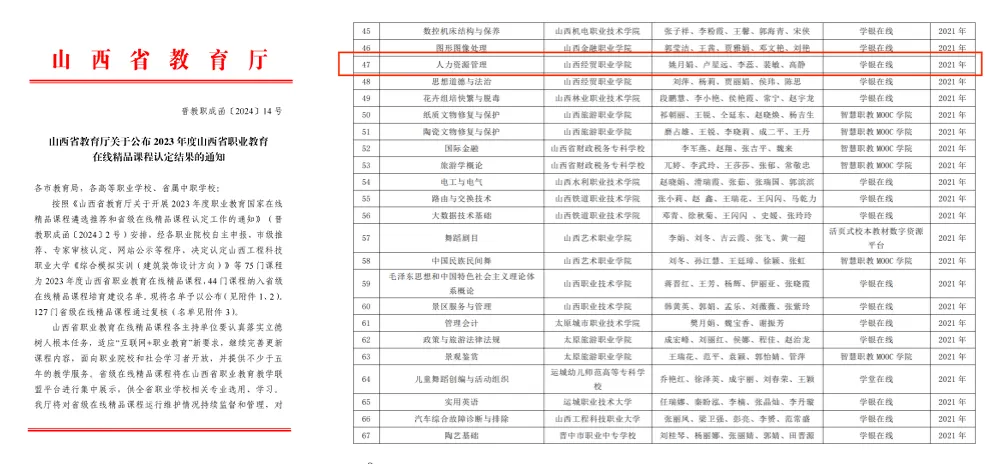 2024年3月,公司高静老师录制的《人力资源》课程,被山西省教育厅认定为山西省2023年度职业教育在线精品课程。该认定由省级教育主管部门组织开展,是衡量职业教育课程建设水平的重要权威评价。此次入选充分体现了公司在职业教育课程开发与教学资源建设方面的专业实力,彰显了《人力资源》课程在教学内容设计、教学方法创新及在线教学实施等方面的突出品质与示范价值。
