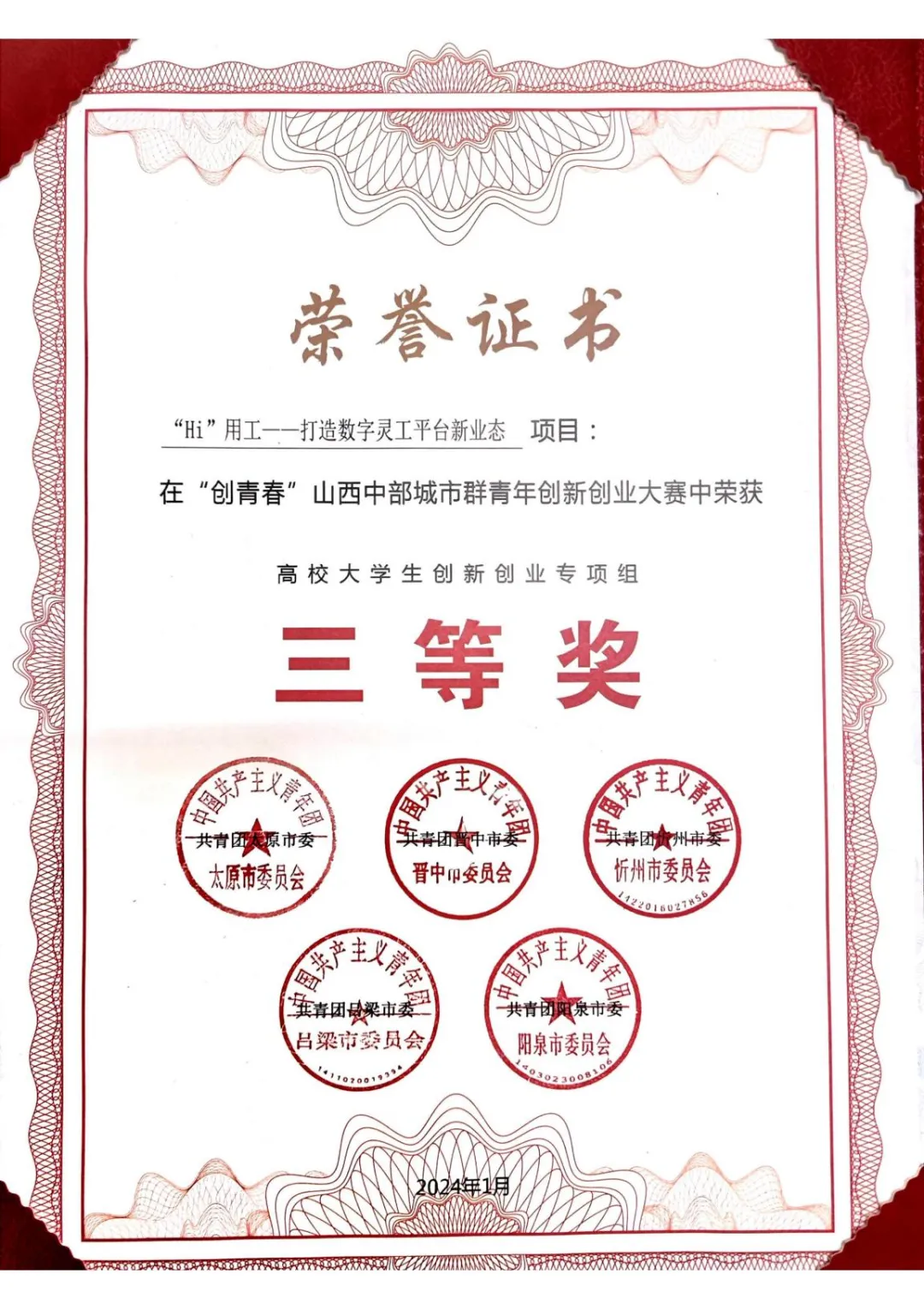 2024年1月,指导高校大学生参加“创青春”山西中部城市群青年创新创业大赛,荣获高校大学生创新创业组三等奖。“创青春”系列赛事是服务青年创新创业的重要平台,在山西省及中部城市群具有广泛的青年参与度和较强的社会影响力。此次获奖充分体现了公司在青年人才培养、创新创业指导方面的专业能力与责任担当,展示了公司助力高校学子提升创新素养、增强创业实践能力的积极成效。