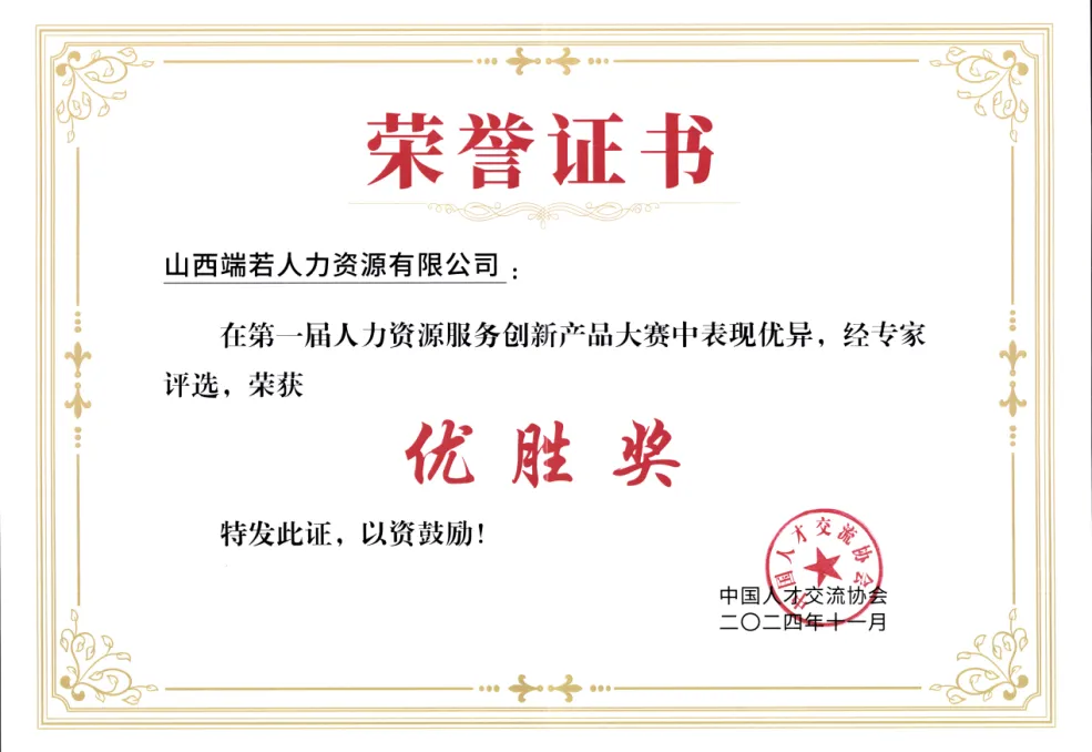 2024年11月,公司携参赛项目《三项制度改革背景下的循证式人力资源管理咨询》参加中国人力资源开发研究会(中人协)第一届人力资源服务创新产品大赛,并荣获优胜奖。该赛事作为人力资源服务创新领域的权威赛事,汇聚了众多前沿创新成果,具有广泛的行业影响力。此次获奖充分体现了公司在人力资源管理咨询领域的创新探索与实践能力,彰显了公司在服务企业改革、推动管理创新方面的专业积淀与行业认可。