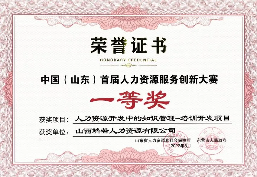 2022年8月,公司项目荣获中国(山东)首届人力资源服务创新大赛一等奖。该赛事作为国内人力资源服务领域的重要创新赛事,汇聚了众多前沿实践成果,具有广泛的行业影响力。公司此次获奖的创新成果,聚焦企业内部人力资源管理理念与方式方法创新,着力破解优员提质增效的现实难题,有效激发人才队伍价值创造活力,实现人力资本效益的最大化。同时,该成果基于人力资源服务数字化转型应用,构建了新型管理模式,充分体现了公司在人力资源管理创新领域的实践深度与前瞻探索。
