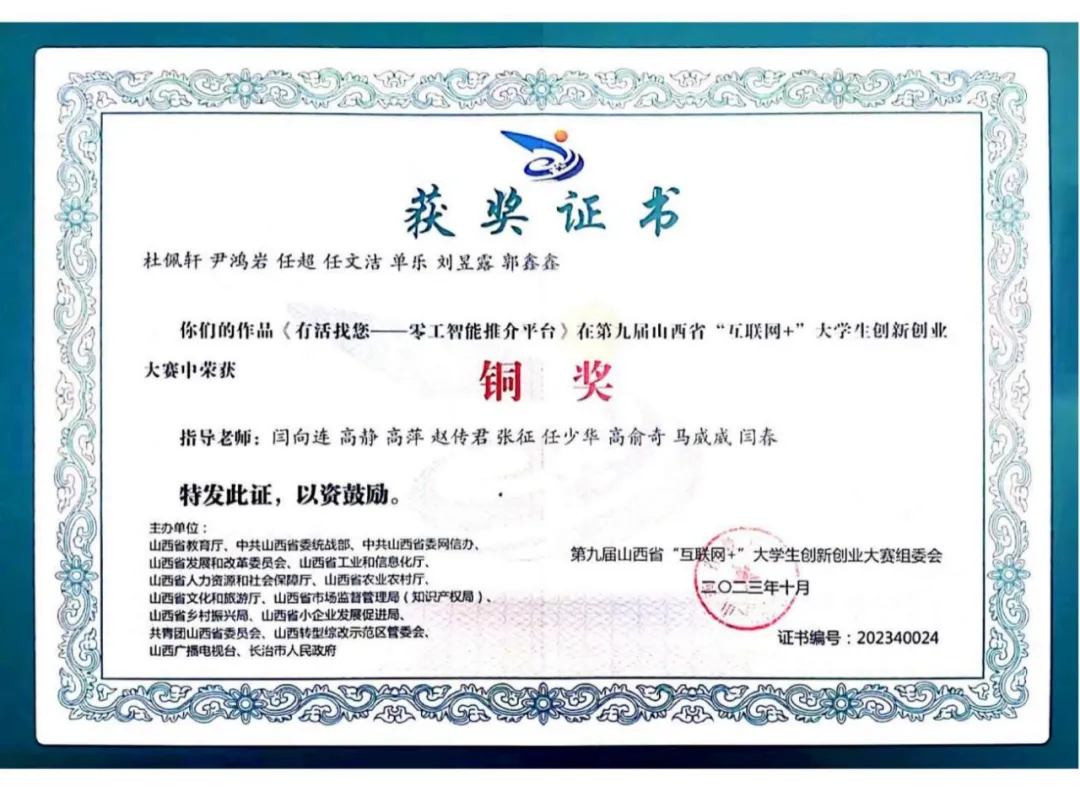 2024年1月,指导高校大学生参加“创青春”山西中部城市群青年创新创业大赛,荣获高校大学生创新创业组三等奖。“创青春”系列赛事是服务青年创新创业的重要平台,在山西省及中部城市群具有广泛的青年参与度和较强的社会影响力。此次获奖充分体现了公司在青年人才培养、创新创业指导方面的专业能力与责任担当,展示了公司助力高校学子提升创新素养、增强创业实践能力的积极成效。