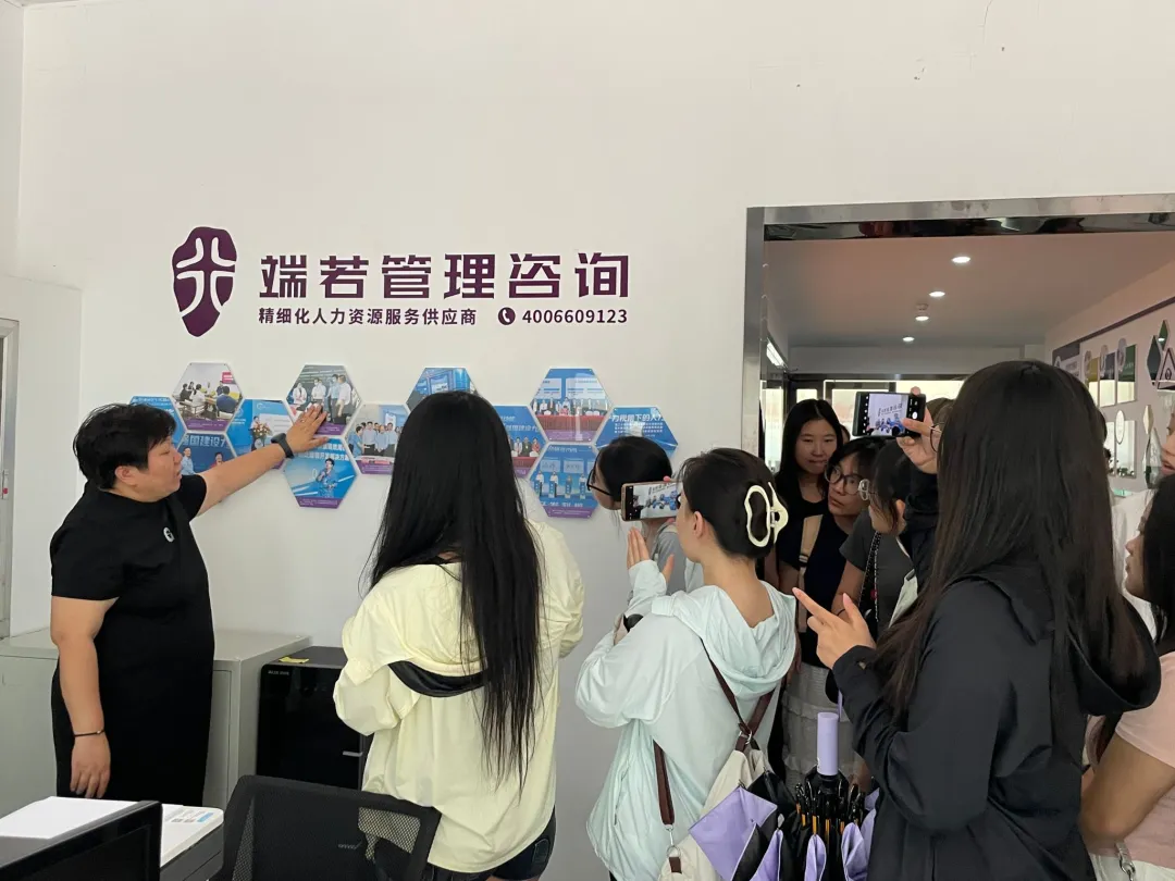 6月24日下午,山西财经大学人力资源管理专业的师生在工商管理学院党委副书记周志刚的带领下,莅临我公司开展“小学期”社会实践活动。在董事长高静的引导下,师生一行深入参观了企业内充满人文关怀的员工功能区。在“悦茶乐园”,师生们驻足欣赏了精心制作的手工艺品,对其创意与工艺表示出浓厚兴趣。心理咨询室高标准配置及完善的减压设施,生动展现了企业在构建“健康职场生态”方面的系统化实践。随后,高董事长详细介绍了端若在人才服务、培训发展、市场调研等六大核心业务板块的运作机制,并阐述了企业以“技术驱动服务升级”为核心优势,持续推动行业在数字化工具应用与解决方案创新方面保持领先的发展理念。